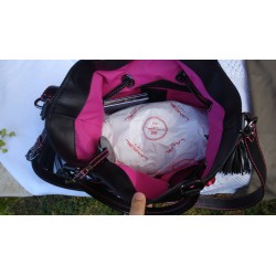 Premier flirt en cuir noir modéle "excentrique",la poche exterieure ainsi que les coutures sont de couleur rose fluo.